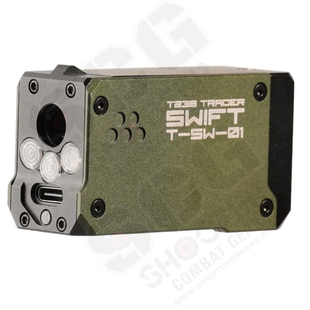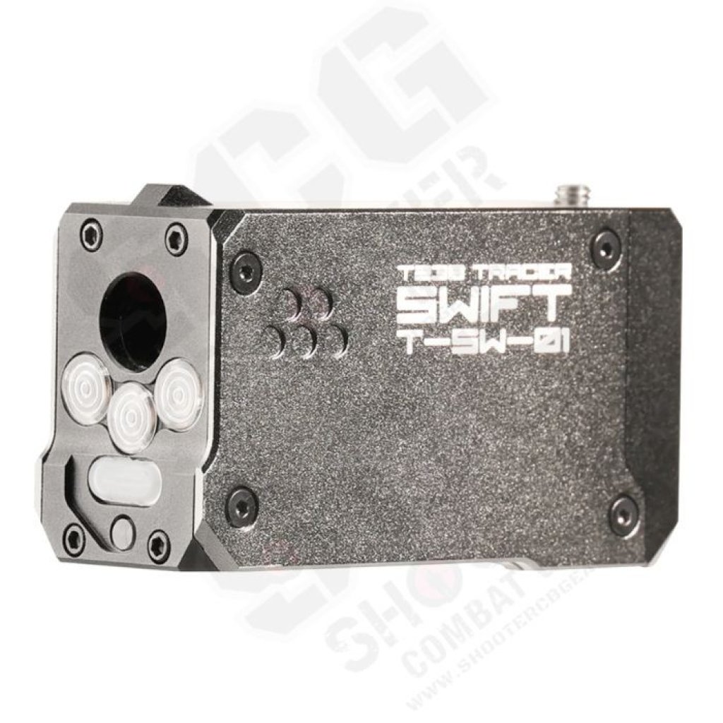 The T238 SWIFT is a lighting device compatible with both 14mm CCW and 11mm CW interfaces. This device integrates tracer BB charging functionality and muzzle flash simulation. When triggered, the system illuminates luminescent projectiles, enabling them to maintain visibility during flight, while simultaneously activating LED modules to simulate muzzle flash effect.