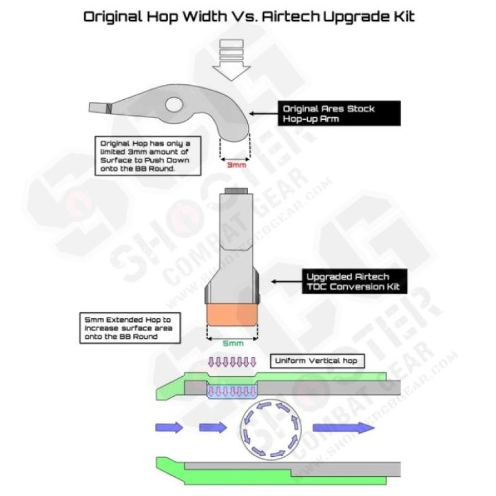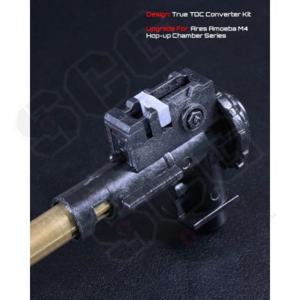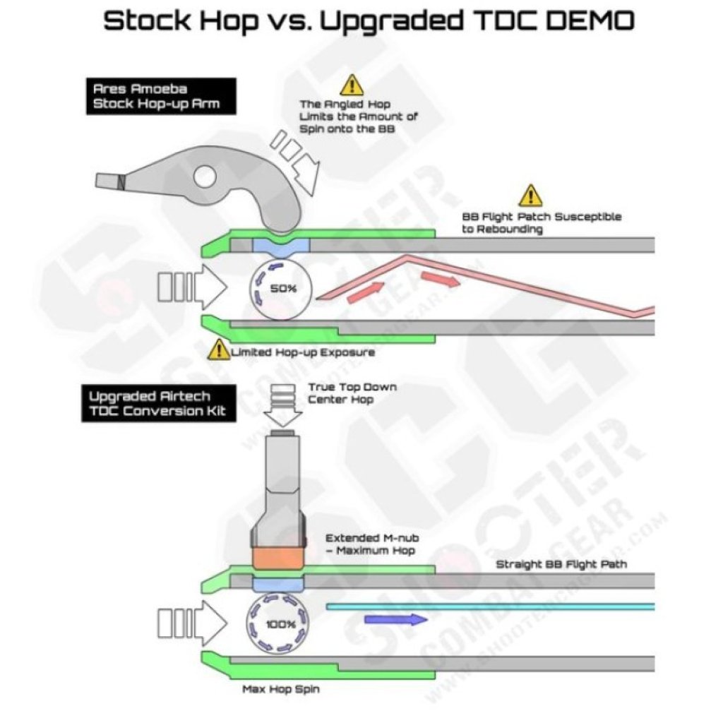 The idea of using a Top-down-center is a well sought after functionality in airsoft that maximizes the amount of friction allowed onto a BB round and there are third part chambers that can achieve this. However, switching to a third party chamber could carry a series of risks such as double BB feeding, misfeeding, and inconsistent air compression. That is the reason why we opted for an upgrade option for the original hop-up chamber that is specifically designed for Ares Amoeba models.