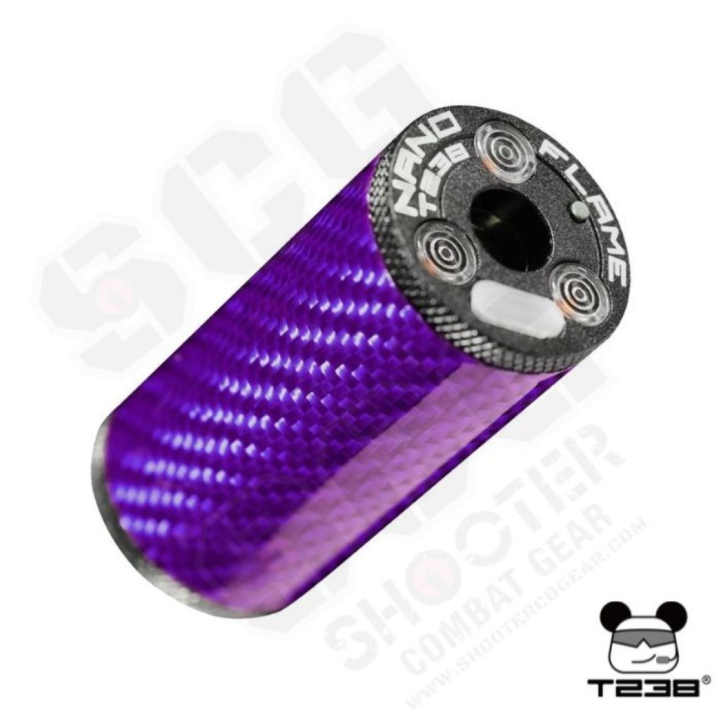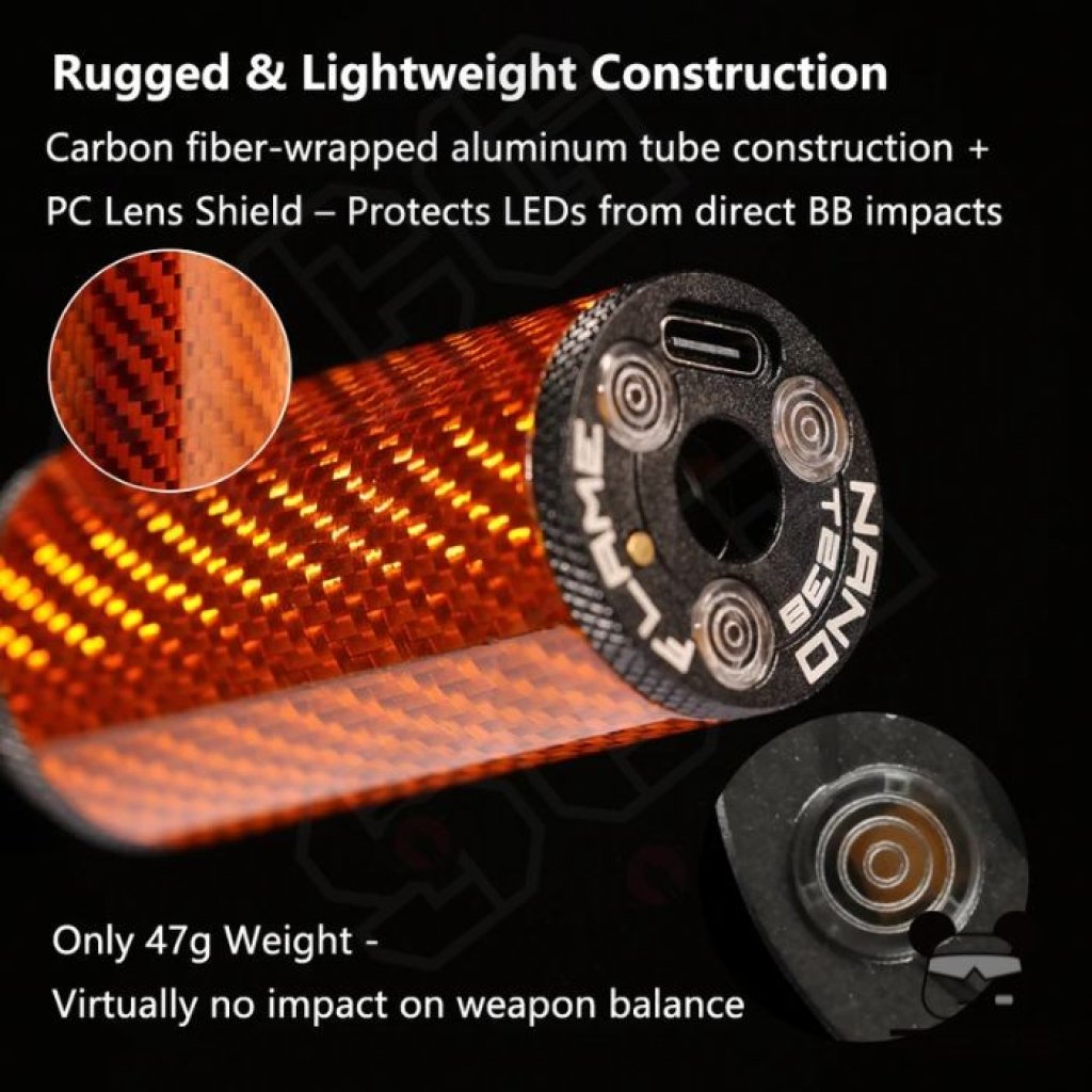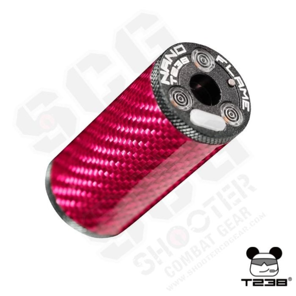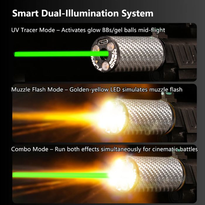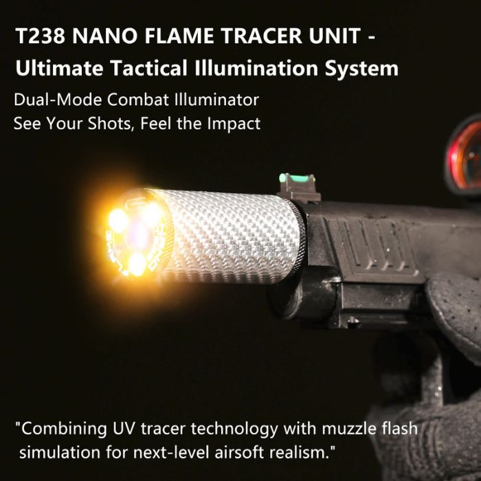 The T238 NANO FLAME Tracer Unit delivers premium durability with its aircraft-grade aluminum and carbon fiber body. Featuring 9 color options and a flame simulation mode for realistic night-game effects, it also offers a customizable auto-shutdown timer (up to 120 minutes) for stealth. The upgraded 600mAh battery ensures long runtime with fast USB-C charging, while durable 14mm CCW threading and a free 14mm CCW to 11mm CW adapter maximize compatibility.