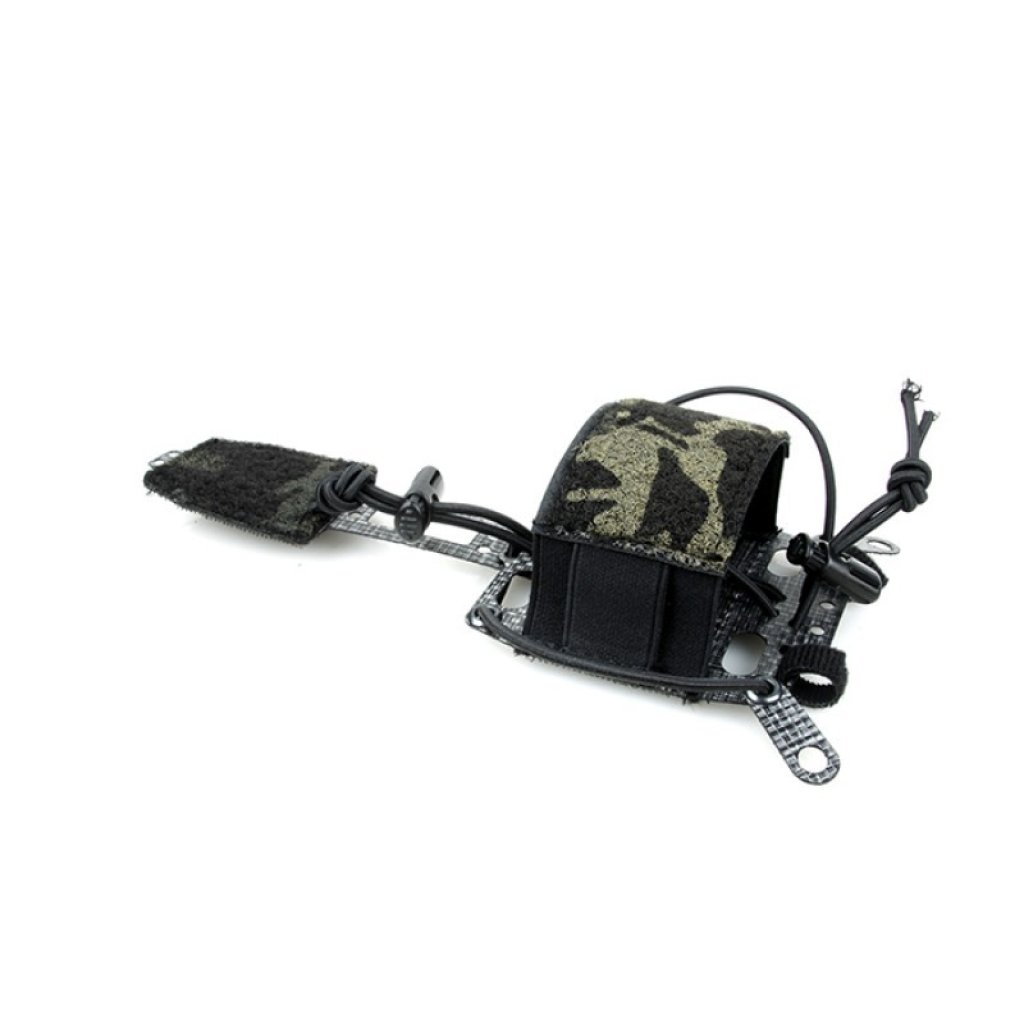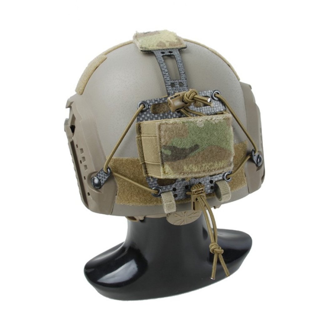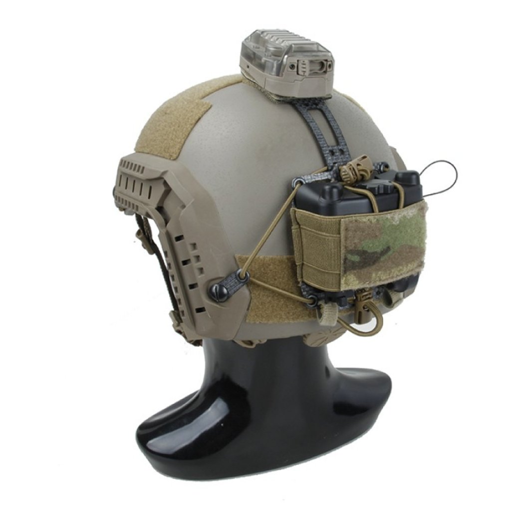 The TMC Lightweight PVS31 Battery Box Retention System provides a way to safely secure a PVS-31 battery box to a helmet. The mounting system is secured utilizing features already found on most helmets in the market. The battery box is held in a sleeve which is affixed to the helmet with hook and can be retained by three anchors. Two lateral anchors attach to the helmet with chin strap bolts or by being looped through accessory rails. The optional third anchor is a firm bridge to an IR Strobe mount that can be adjusted and affixed to the top of the helmet with hook. Tie-points at the front of the mount can be used to attach a strobe lanyard and secure the system at the front of the helmet as well.