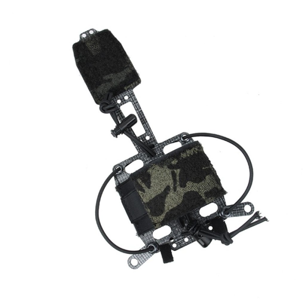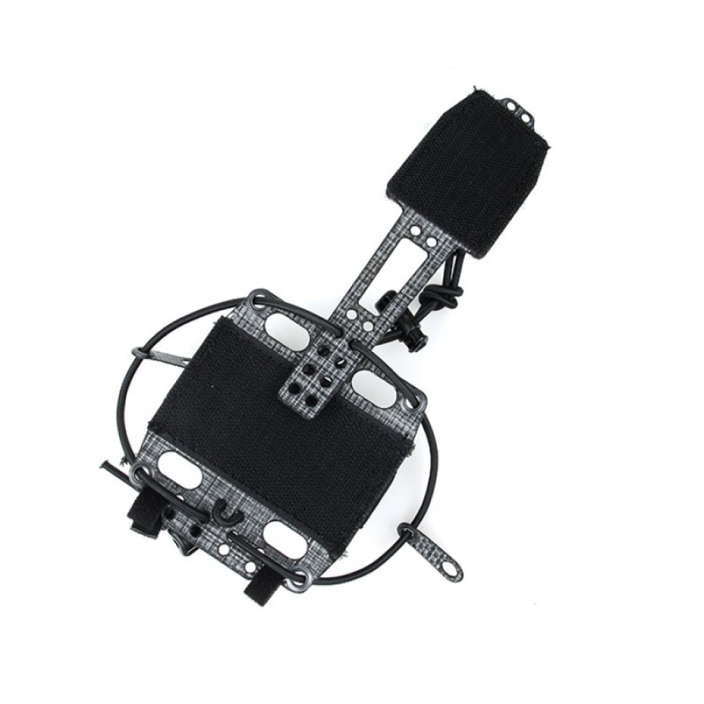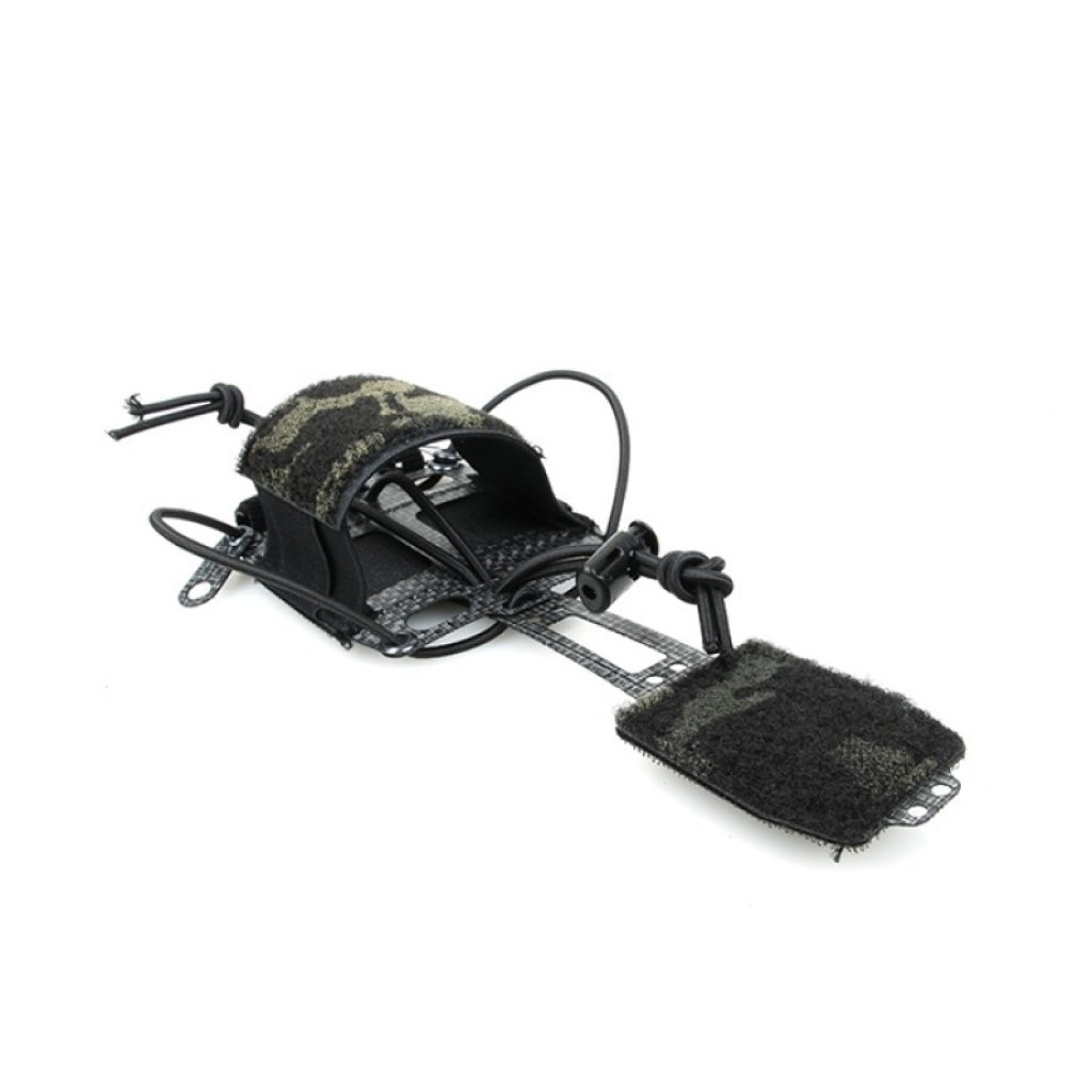 The TMC Lightweight PVS31 Battery Box Retention System provides a way to safely secure a PVS-31 battery box to a helmet. The mounting system is secured utilizing features already found on most helmets in the market. The battery box is held in a sleeve which is affixed to the helmet with hook and can be retained by three anchors. Two lateral anchors attach to the helmet with chin strap bolts or by being looped through accessory rails. The optional third anchor is a firm bridge to an IR Strobe mount that can be adjusted and affixed to the top of the helmet with hook. Tie-points at the front of the mount can be used to attach a strobe lanyard and secure the system at the front of the helmet as well.